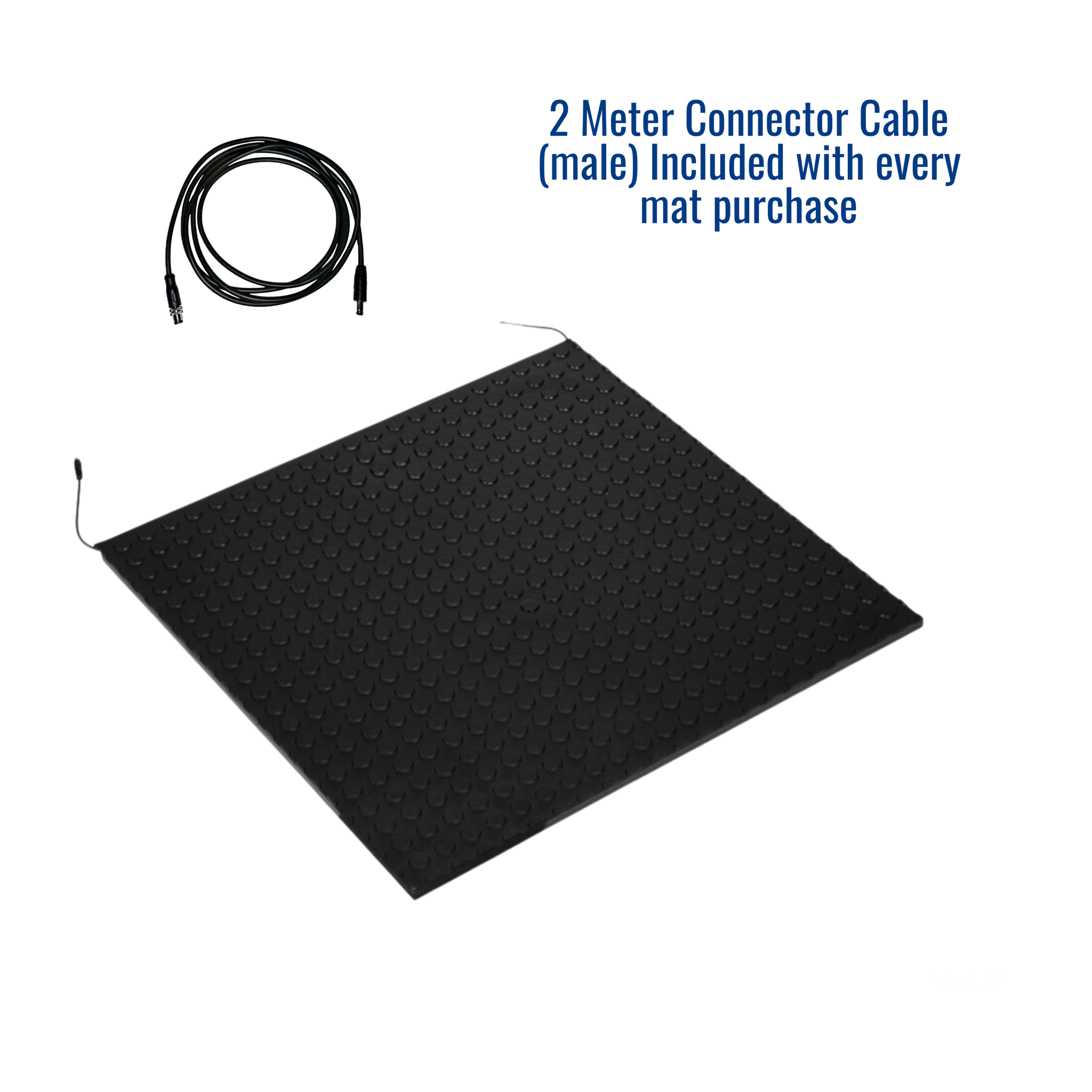 (1) 3-pin male M8 connector and (1) 3-pin female M8 connector. Included cable connects to the male M8 connector and is compatible with Plyomat 1.0, 2.0, 3.0 and Just Jump Controllers.