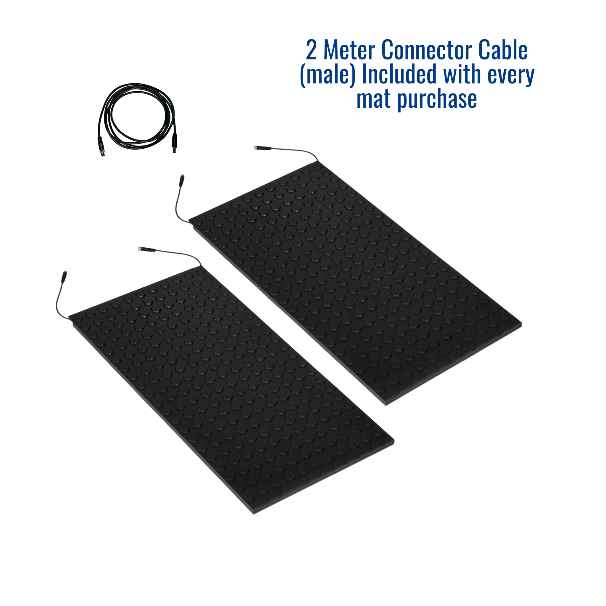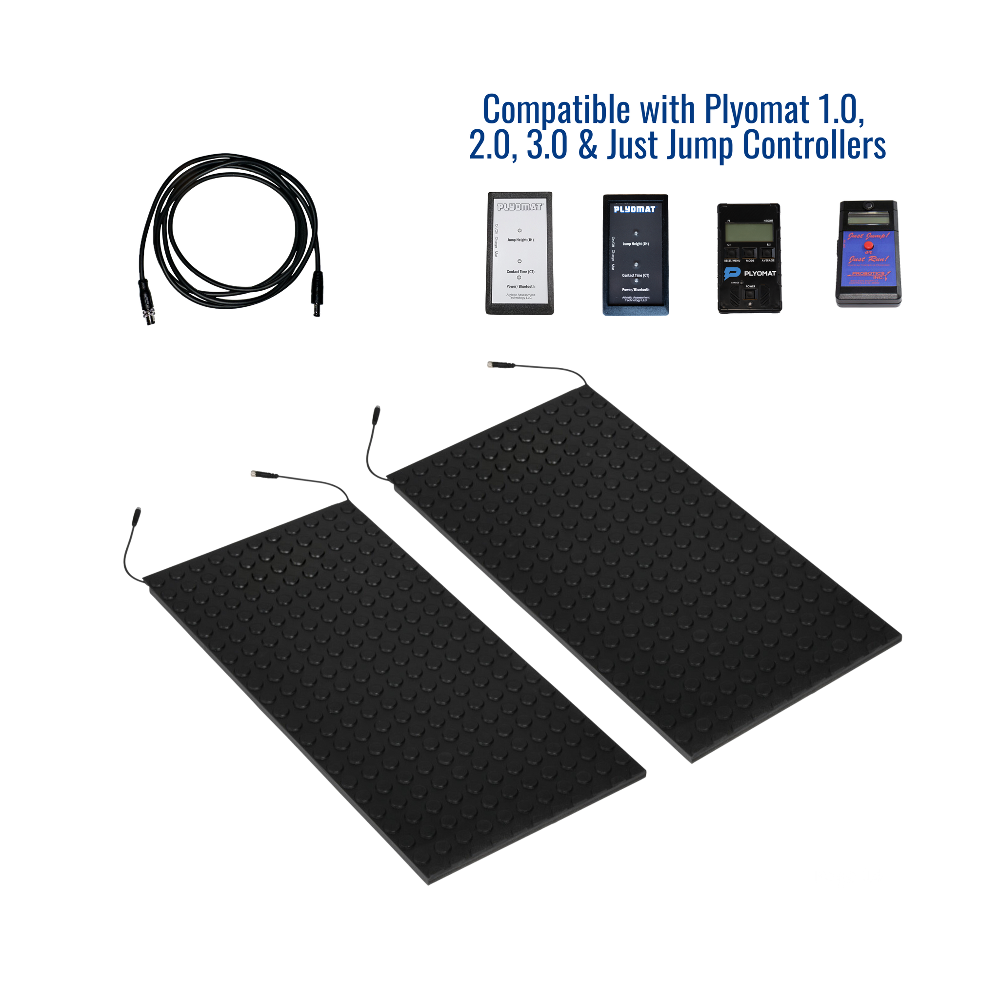 (1) 3-pin male M8 connector and (1) 3-pin female M8 connector. Included cable connects to the male M8 connector and is compatible with Plyomat 1.0, 2.0, 3.0 and Just Jump Controllers.